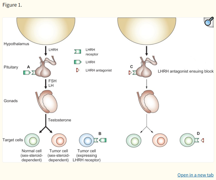 El poder terapéutico deDegarelix Proviene de su bloqueo competitivo directo de los receptores de GnRH en la glándula pituitaria. El hipotálamo libera naturalmente GnRH para estimular a la hipófisis a secretar hormona luteinizante (LH) y hormona folículo estimulante (FSH). Luego, estas hormonas indican a los testículos que produzcan testosterona, un impulsor clave del crecimiento de las células del cáncer de próstata.