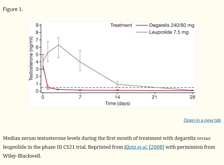 Degarelix se une fuerte y reversiblemente a estos receptores hipofisarios, deteniendo inmediatamente la liberación de LH y FSH. Esta rápida inhibición conduce a una reducción dramática y rápida en la producción de testosterona testicular. Una ventaja definitoria sobre los agonistas de GnRH es la ausencia de un "pico de testosterona" inicial o un brote clínico. Inicialmente, los agonistas sobreestimulan los receptores, lo que provoca un aumento transitorio de testosterona que puede empeorar síntomas como dolor de huesos u obstrucción urinaria en pacientes vulnerables.Degarelix evita esta fase peligrosa, comenzando la supresión de testosterona el primer día de administración y alcanzando niveles de castración médica (≤0,5 ng/mL o 50 ng/dL) en más del 96% de los pacientes hacia el día 3. Este rápido inicio es crucial para los pacientes que requieren un control inmediato de la enfermedad.
